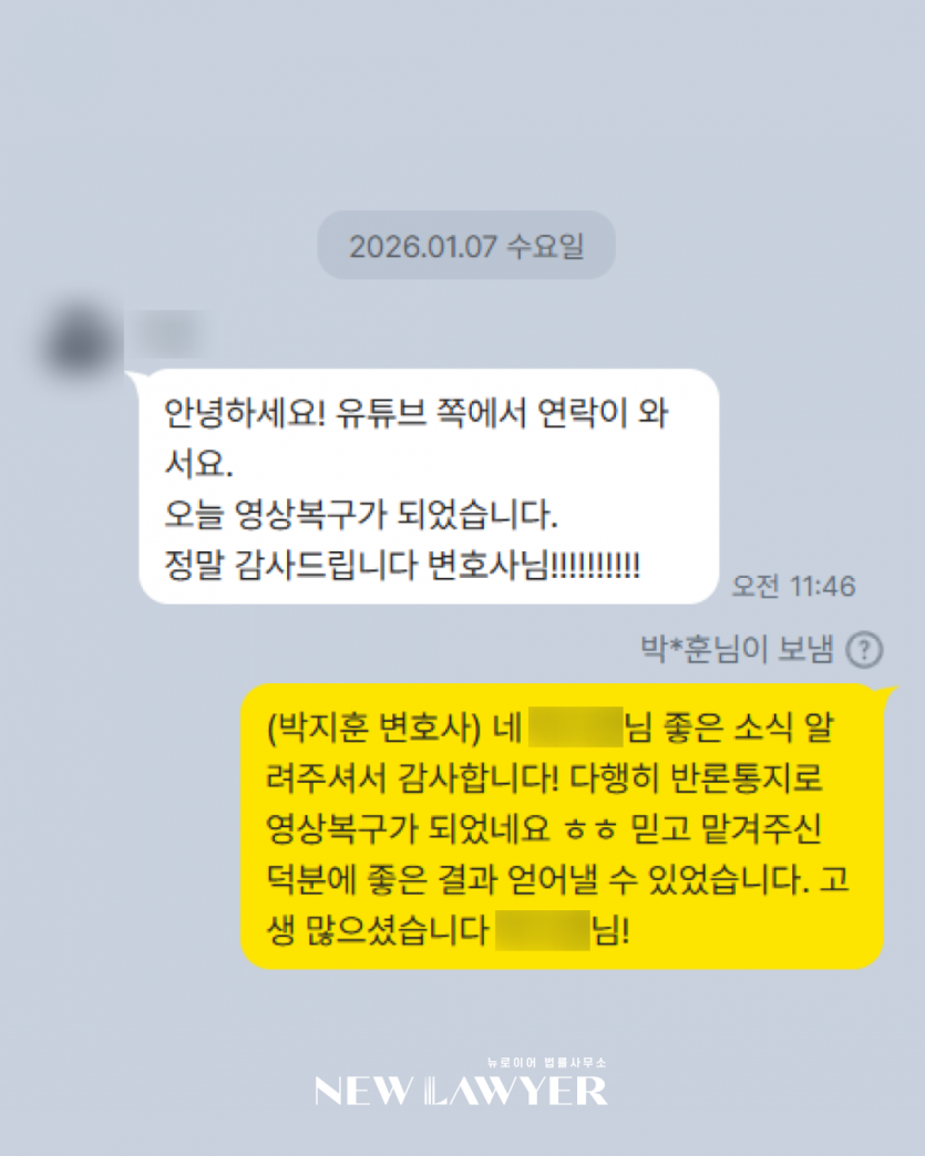 "유튜브에서 연락이 와서 오늘 영상 복구가 됐습니다! 감사합니다. 변호사님!"